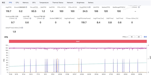 线Hz的好屏幕,支持《和平精英》165Hz模式,一局30分钟的排位下来,平均帧率达到了164.3帧,稳帧指数仅有0.4。